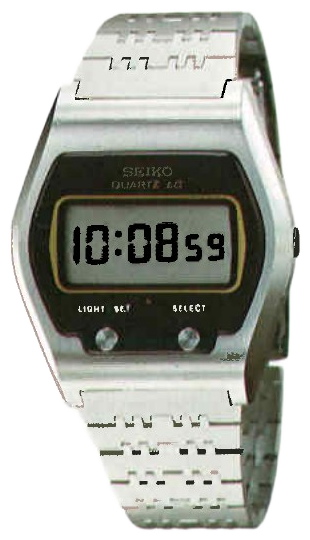 This is a Seiko LC digital watch from the late 1970s, part of Seiko's early LCD quartz collection. Notable for its distinctive cushion-shaped case with integrated bracelet and dual pushers, representing Seiko's pioneering work in digital timekeeping technology.