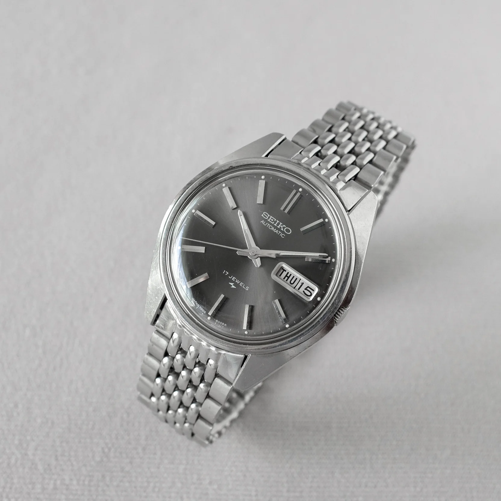 This is a Seiko 7006-8000 automatic watch from the 1970s, featuring the reliable 17-jewel 7006A movement with day-date display. Notable for its classic dress watch proportions with applied indices and the distinctive sunburst silver dial treatment that was characteristic of Seiko's mid-range automatic lineup of this era.